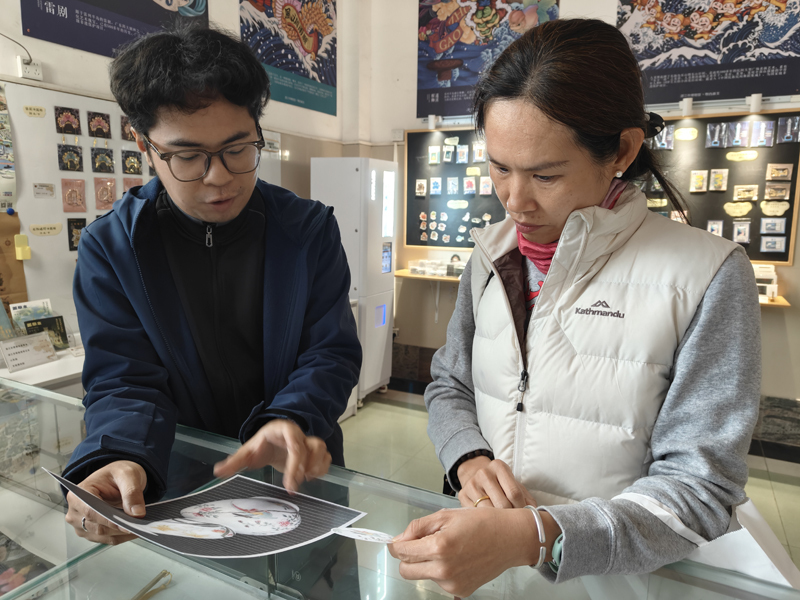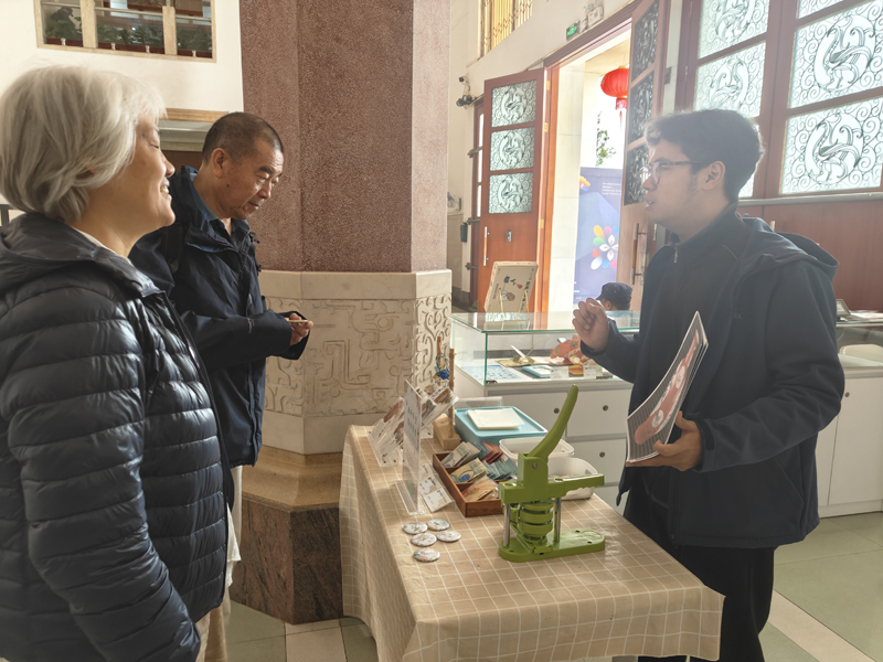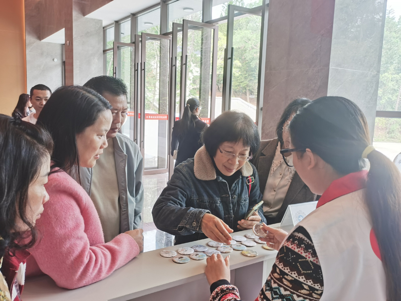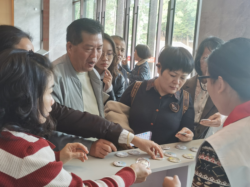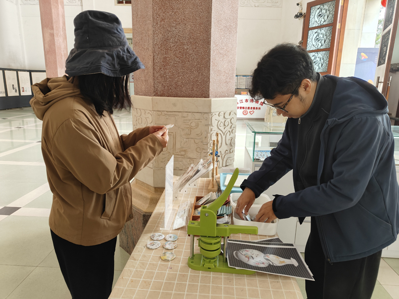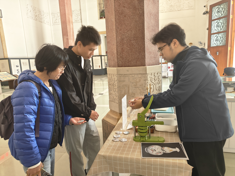 本次徽章制作的素材大部分取材自馆藏瓷器文物,以春日生机为媒,将瓷器纹饰与惊蛰节气的蓬勃生机巧妙融合,让文物元素在创作中焕发新生,实现了传统文化与现代生活的美好相遇。活动现场,工作人员介绍了“广彩瑞兽图椭圆瓷盘”“粉彩花鸟纹瓷葫芦瓶”等瓷器上的纹饰内容、寓意及艺术价值,并耐心为观众找出每枚徽章图案的出处。在工作人员指导下,观众们亲手制作专属徽章,在动手实践中真切感受到文物也可以与我们的生活相融。