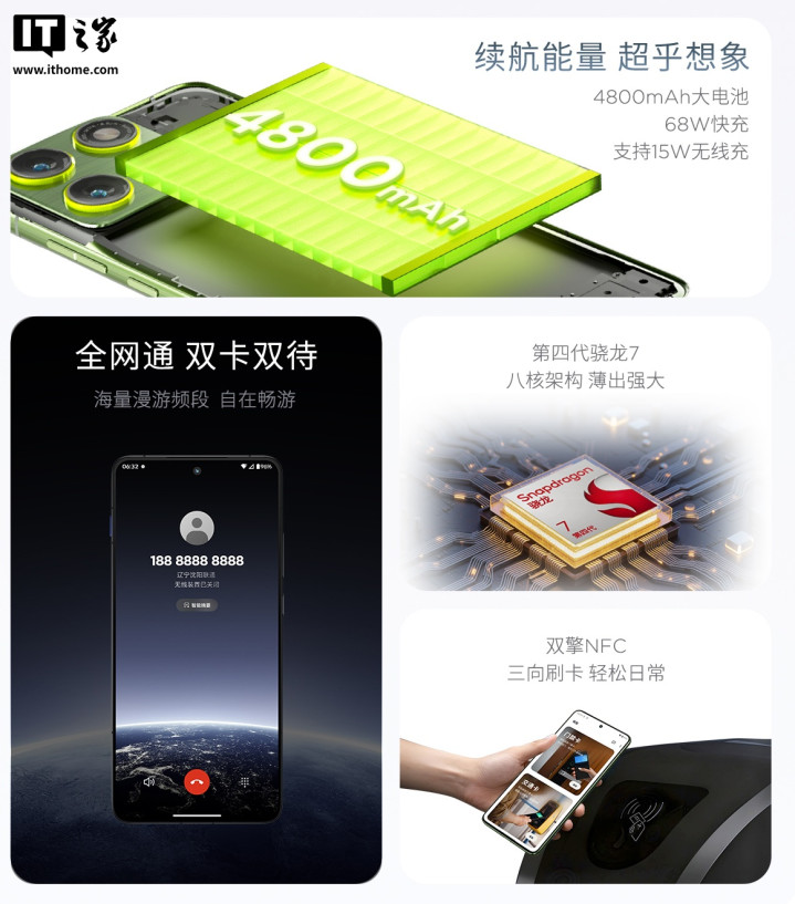 规格方面,该机搭载第四代高通骁龙7处理器,提供12GBRAM,匹配256/512GB存储空间,内置4800mAh电池,搭配68W有线快充+15W无线充电,同时机身内置NFC,支持三向刷卡。